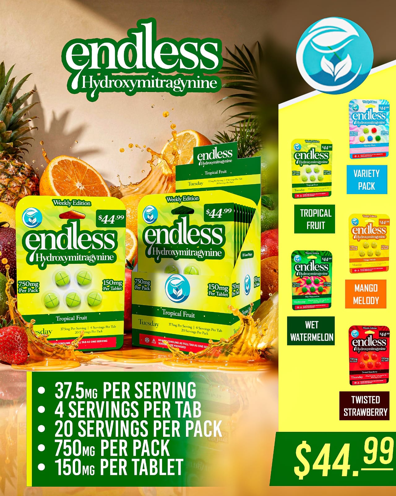 Enjoy the best of every flavor with the Endless Hydroxymitragynine –Weekly Edition in Flavor Mango Melody ,Twisted Strawberry ,Wet Watermelon, Variety Pack,Tropical Fruit. This special pack is perfect for those who want to experience multiple delicious flavors while maintaining the same reliable strength and convenient tablet format.